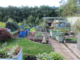 I got up this morning to discover that my Jerusalem artichoke had disappeared... In fact I discovered later on that it had snapped in half and disappeared over the wall. It's such a shame as we have watched it grow and grow. It must have been close on ten feet tall and we had high hopes of seeing it flower. It was the only one I hadn't topped as I thought the holly tree was giving it plenty of support. I suppose that given the wind through the night it was inevitable. I was expecting it to be wet when I went for my walk but the rain came later... and oh boy did it hammer down. Then in true British style it all dried up leaving a gorgeous afternoon for gardening. I've cut down more sweet peas and removed the support. Then I moved my obelisk into the sweet pea spot as I hope to grow French beans up it next year. I've transplanted spring onions into the water butt raised beds and moved all manner of tubs and boxes around the garden. I'm sure that I have muscles like Popeye :-)